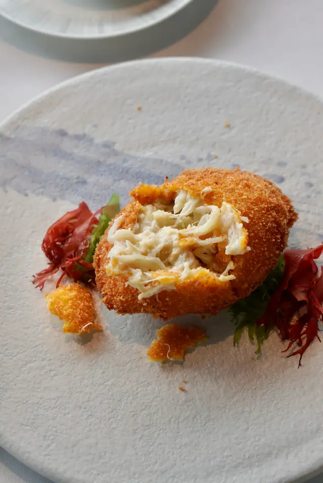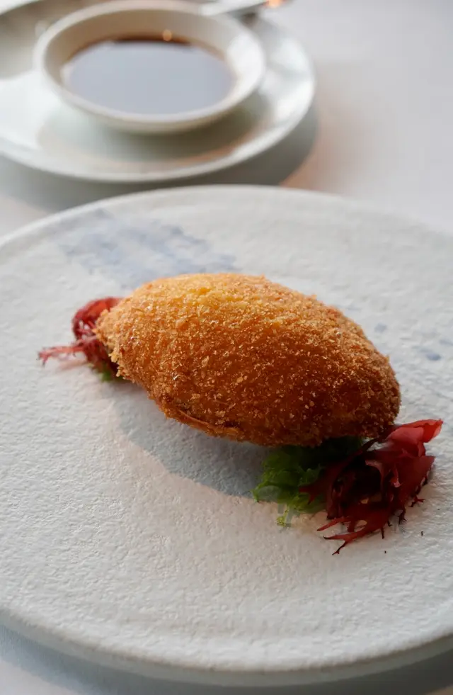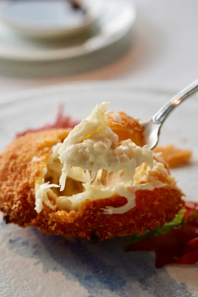 蟹壳裹上面包糠油炸,金黄色的外壳封印住内馅滚烫流心的温度,表面是可以吃的,极致酥脆却又不见油。