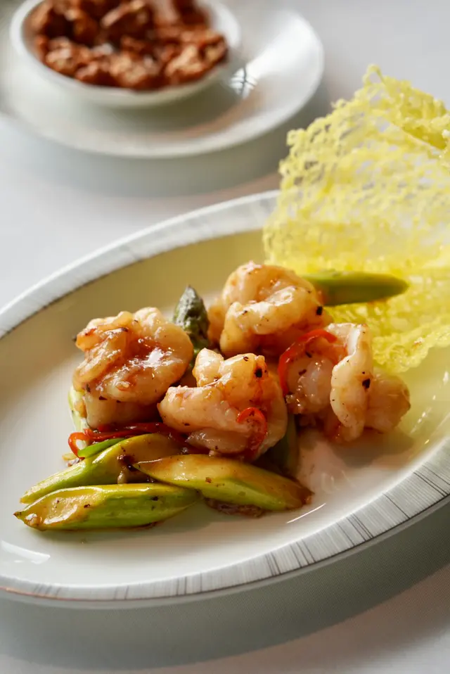 经过快火翻炒的虾球是中间刚熟的程度,肉质饱满得快要爆出来,鲜甜的汁水也在咀嚼瞬间滋滋往外冒。最嫩部位的芦笋,色泽上呈现出从嫩绿到青绿的渐变,鲜脆灵动。