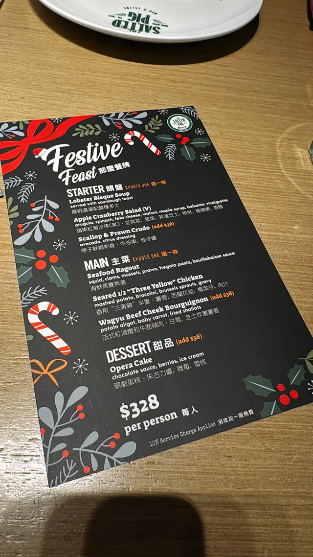 臨近聖誕節,已經開始有Christmas Menu,頭盤主菜加甜品都係三舊水,聖誕節可以再encore