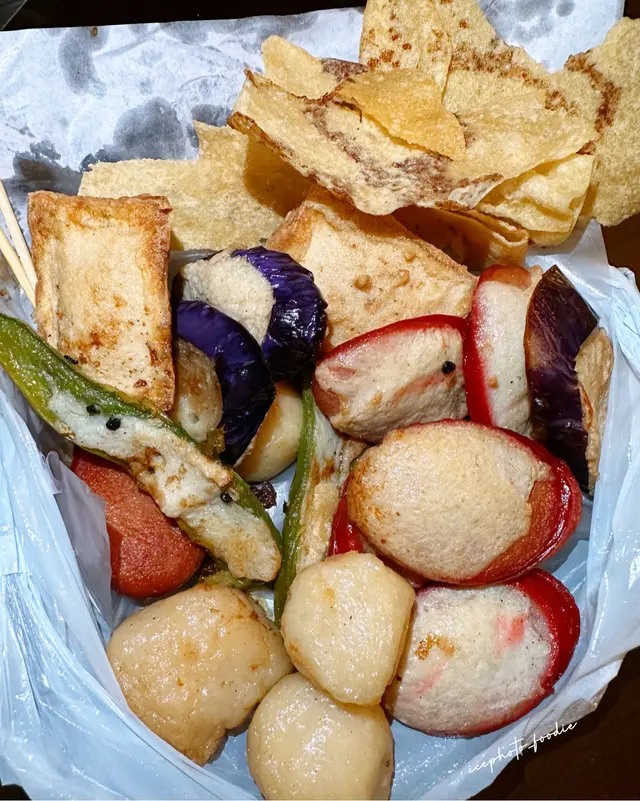 今次每款試少少,揀好炸物後會即時炸番熱,可以隨個人喜好加醬油、喼汁、辣醬等。基本上釀薄薄一層魚肉,自己最鍾意青椒🫑和茄子🍆濕潤唔會乾,主要食蔬菜本體多,紅腸大大塊,炸豆腐一大舊,有豆香味,但口感實在偏乾偏硬,魚蛋微咬口,口感不錯,而雲吞皮炸到薯片咁脆。剛炸好出爐較油,拎到番去岩岩好,一大袋廿件先廿蚊,宵夜飽到不得了,呢個價錢唔好要求太多,今時今日一蚊一件算抵食,食得幾開心😆!