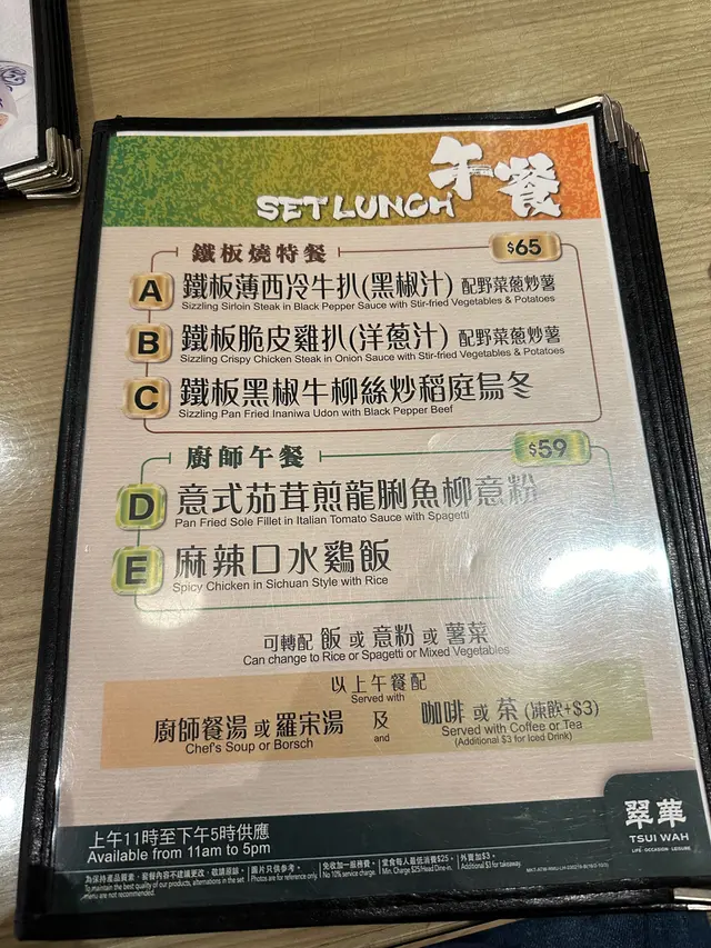 午市套餐餐牌之中,見到有鐵板牛扒,仲要價錢相當吸引。西冷牛扒經過鐵板的煎烤,既能保持了牛肉的嫩滑口感,搭配濃郁的黑椒汁後,份外惹味。翠華亦做足本份,可以選擇飯/意粉/薯菜,不過我覺得鐵板牛扒配薯菜實在一流,無得輸。