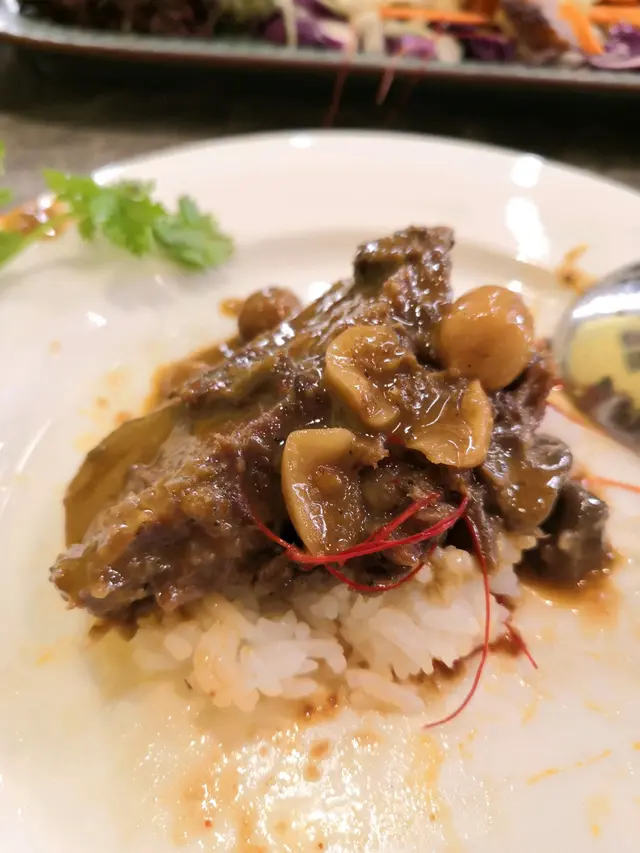 「瑪莎曼咖哩和牛面頰 」,牛面頰超嫩腍,配上瑪莎曼咖哩醬汁及花生配料,有點像吃羊腩煲,很搞笑,哈哈哈哈。