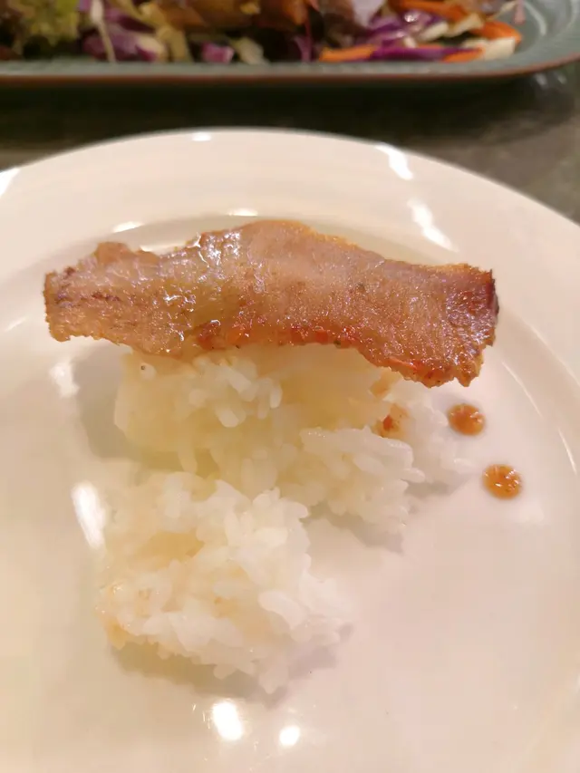「泰式燒西班牙黑毛豬頸肉」,黑毛豬頸肉烤得很香口,點上泰式酸辣醬汁,很不錯,送飯吃一流,仲有餐廳是白飯任添,愛吃飯的你很合適。