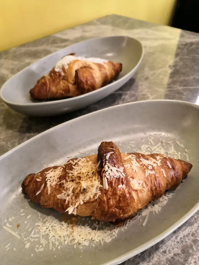 「法式龍蝦湯流心牛角包」,牛角包面上灑了芝士,法式龍蝦湯混合了牛角包裡的牛油香以及芝士的鹹香味,簡直是三重滋味享受,超邪惡極好味。