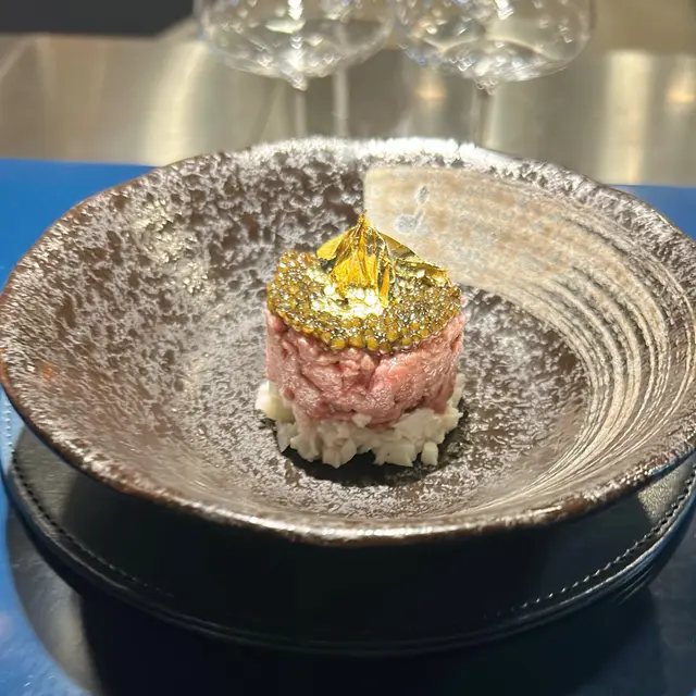 分為三層 牛柳他他經過慢煮 會帶嚼勁🐮底層係水煮椰菜花 上面伴以高貴魚子醬及金箔👏🏻奢華嘅象徵