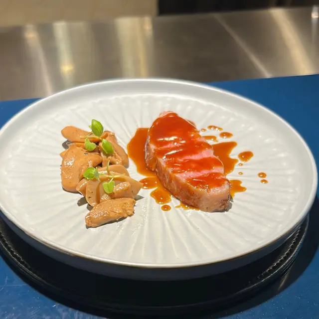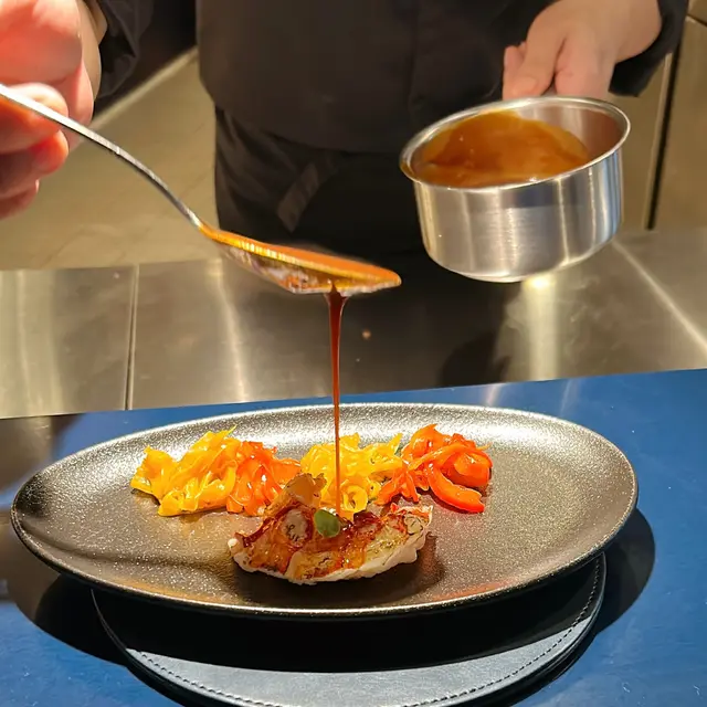 法國藍龍蝦🦞慢煮過後 肉質更為緊實但不韌 輕輕烤炙過 增添香味 而龍蝦汁則由紅蝦頭及龍蝦頭熬製而成 非常濃郁☺️