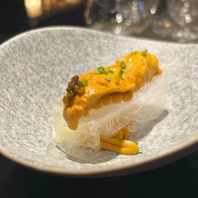 加拿大海膽一定係主角 海膽味道濃郁且creamy 非常新鮮🤓水晶麵包係廚師以薄芡製成 造型好美☺️