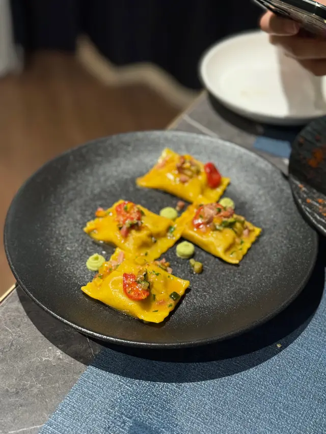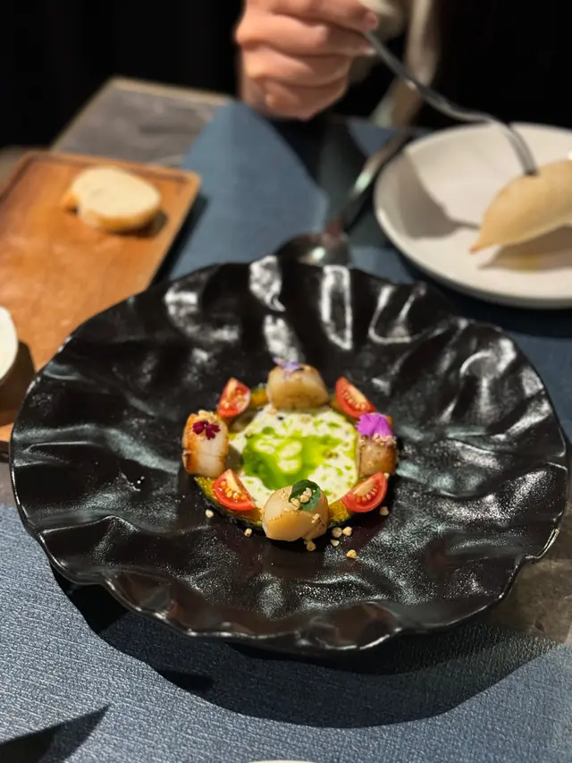 南瓜點綴。 帶子鮮甜,整體入口有肉汁,啖啖濃郁南瓜香!擺盤有種神秘高貴感!南瓜醬香濃,配上香濃的燒帶子,及放醬汁作點綴。