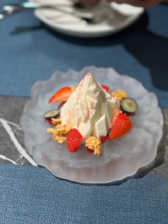 精緻度滿滿甜品,用乳酪整成的慕絲雪山,口感特別,輕身中又有口感,層次滿滿,味道酸酸甜甜的,配果醬和生果。清爽解膩