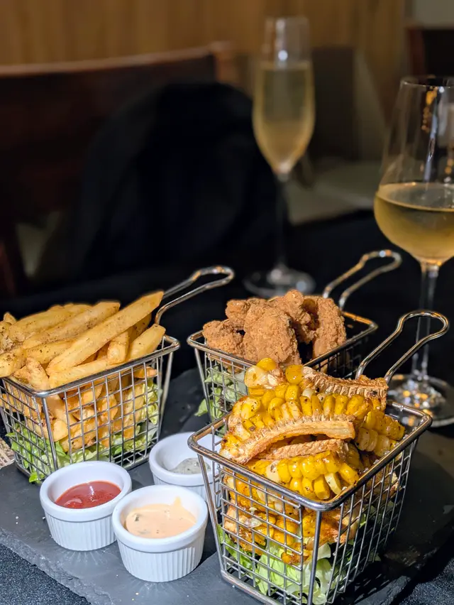脆炸魷⿂圈、炸香草單⾻雞翼(香草/⽔⽜城/鹹蛋⿈)、意式炸薯條(原味/⿊松露/海苔)、墨西哥炸粟⽶、是⽇湯品、雜菜沙律、蒜蓉包,任食到飽,全部炸得乾爽香脆,配幾款sauce一齊食超開心🤩