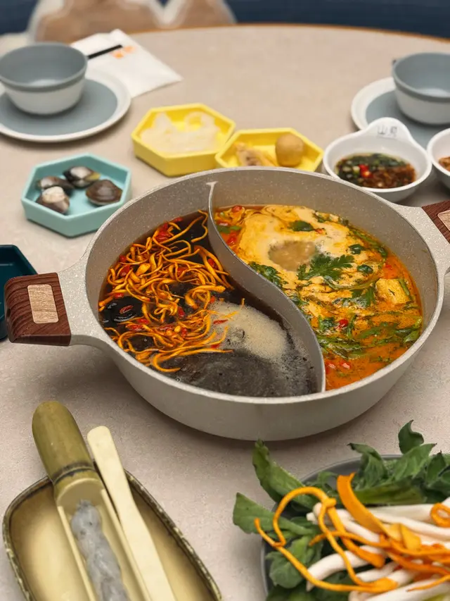 👉🏻上品蟲草花木耳鍋 和 風味沙茶老鍋 一邊煮菜和海鮮 一邊煮肉煮麵等食材 推薦呢款鴛鴦鍋配搭