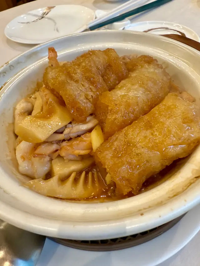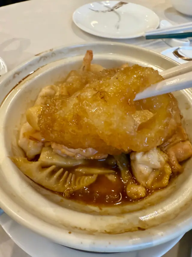 紅燒魚鰾煲係一道非常滋補嘅潮州菜,以魚鰾(即魚肚)為主角,配搭竹筍、雞肉等材料,慢火炆煮至入味,魚鰾吸收晒湯汁,大大塊魚鰾晶瑩剔透,吸滿晒濃郁醬汁,口感軟糯又彈牙,啖啖都充滿膠質,啲湯汁好香濃!