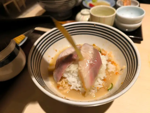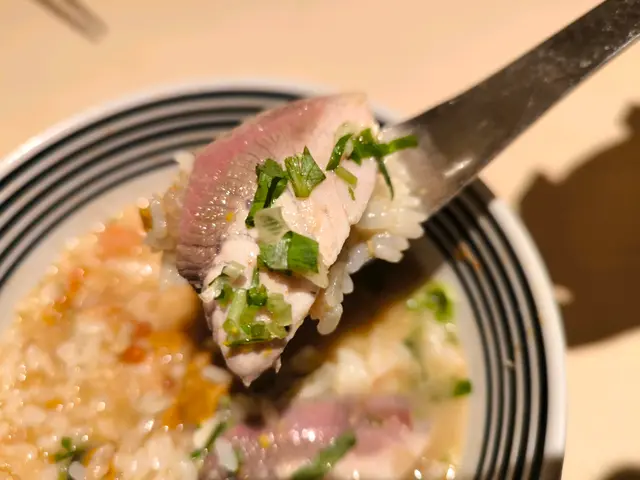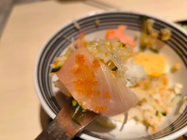 保留少許飯和刺身,變成一道茶漬飯,店員還會加多少許白飯,才放入刺身在飯之上,然後把調魚湯加入飯之中,最後加上葸粒,那鮮味十足的魚湯和海鮮丼,把那鮮味變得更香濃。喝上一口湯,完全有著蛋黃醬和和海鮮丼的鮮味,連湯飯一拼吃下,讓人十分驚喜,絕對不能錯過這碗茶漬飯。