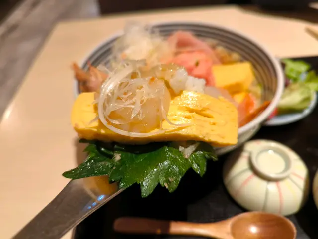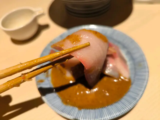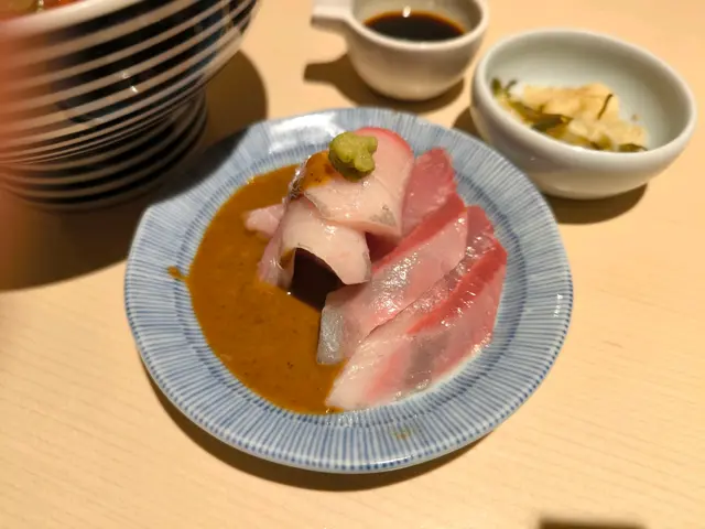 先試時令刺身刺身的油脂味不錯,簡單加少許麻胡醬,醬汁很香,但又不會搶過刺身原有鮮味,非常美味。先把蛋黃鼓油汁加入飯中,再把飯和刺身塔拌勻,吃上口每口飯都吃出刺身的鮮味,還有象扙蚌的爽脆口感,魷魚膠質感,都讓人難忘。