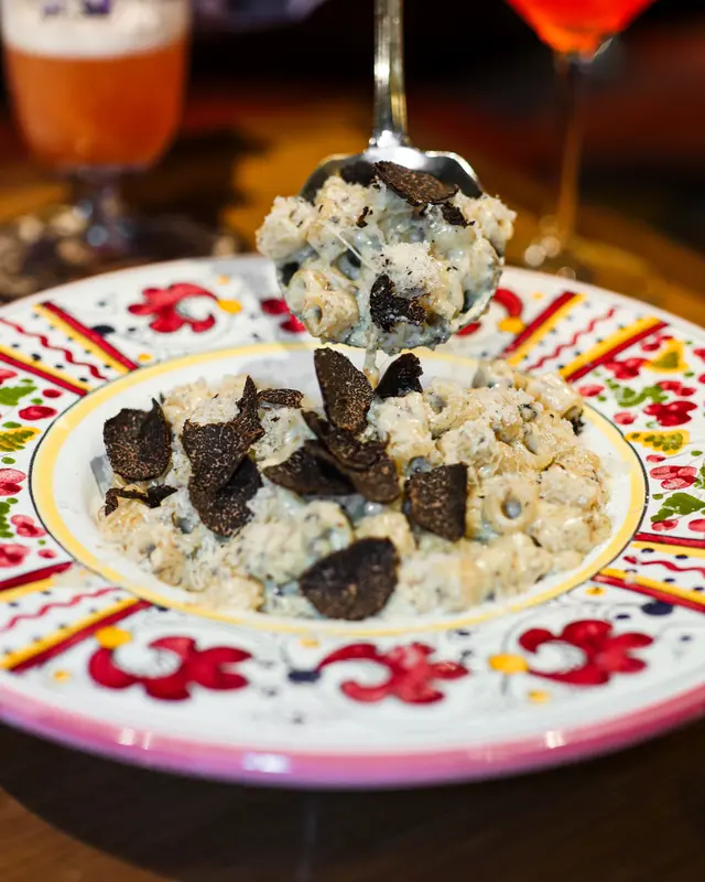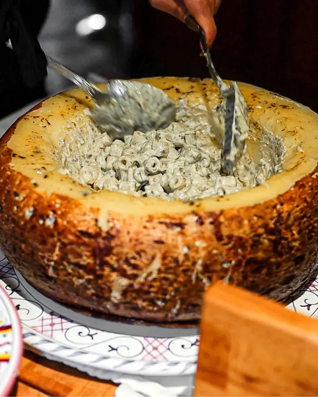 必試❤️ 店員先將熱辣辣嘅Tubetti短管意粉倒入巨輪芝士攪勻,熱力使芝士溶化令意粉蘸滿醬汁😍 再即刨巴馬臣芝士及黑松露片,芝士味好濃郁呢!