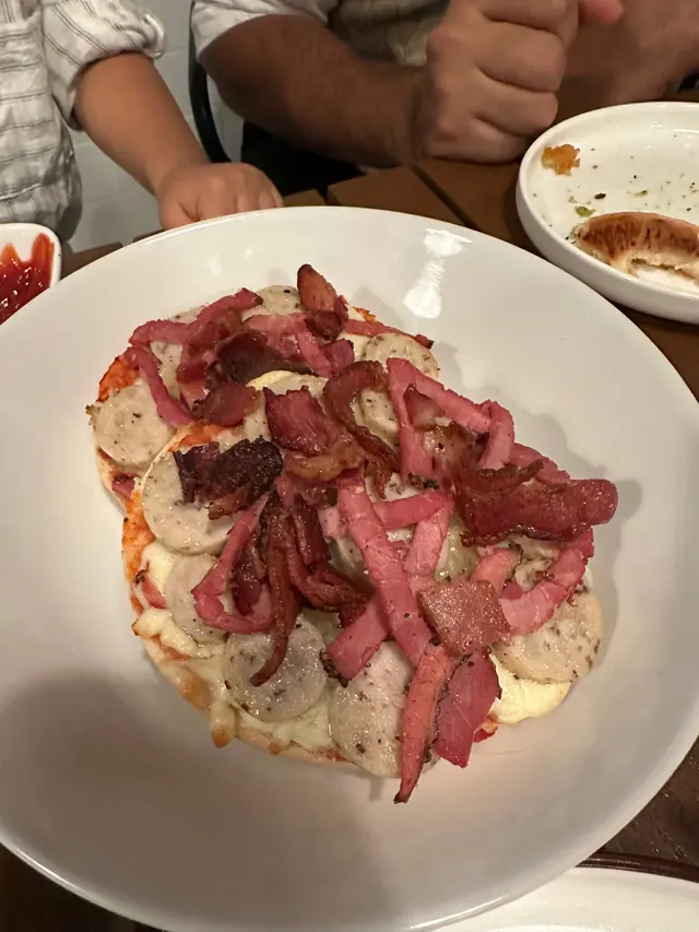 第一次食Bagel整嘅pizza 意外地好食!牛肉腸加埋焗到好脆嘅培根🥓一齊食,真係好惹味~好似食緊辣肉腸pizza咁呀!芝士🧀多到可以拉絲~