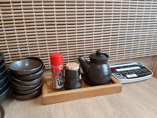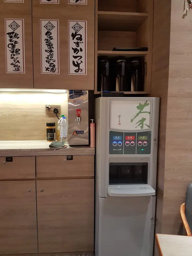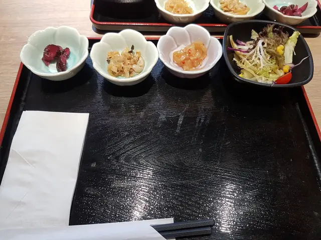 有趣的是當點餐以後食物非是一次過上,侍應分別奉上兩格定食盤,主菜的位置騰空,上面卻放有各色小食與沙拉。然而看著四款小點,既沒有麵豉湯,又不見熱茶,這樣乾啃怎麼成?問一問侍應始知這兒設有自助茶水區,適隨尊便。這似乎是模仿日本食堂的佈置,不過坐在卡廂要爬進爬出地自行斟水卻是有點麻煩。話說回來,其實套餐附有飲品,只是小的一向不愛軟性飲料,故還是老套地攬著杯熱綠茶。