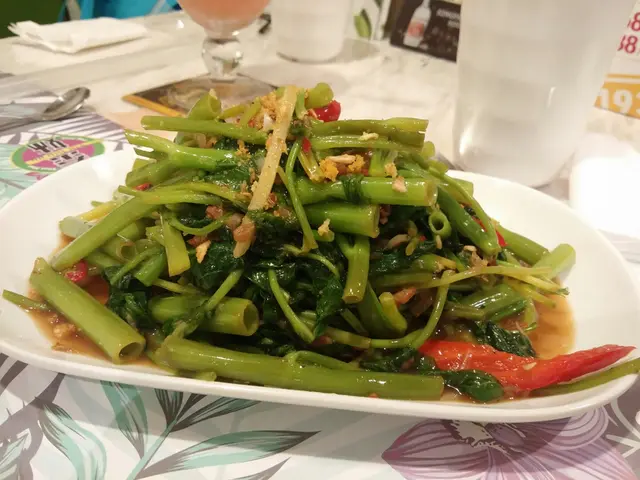 馬拉盞炒通菜,這個馬拉盞炒通菜份量疊起象座小山丘,炒得爽口又入味。