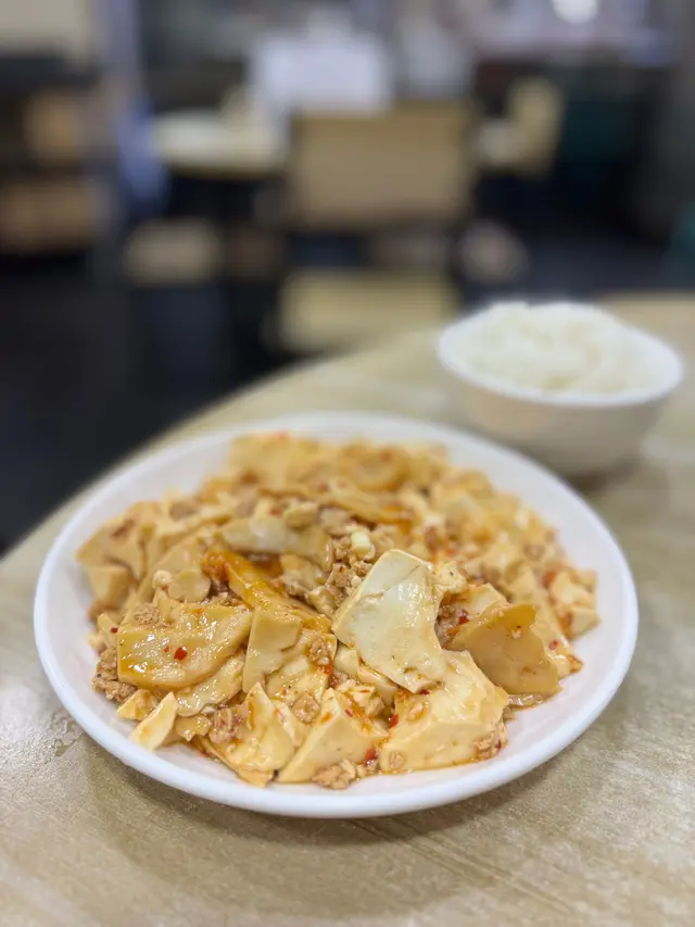 用豆干碎取代了免治豬肉,口感味道上完全冇違和感,用了硬豆腐,所以不容易煮到太碎或者爛咗,辣度剛好