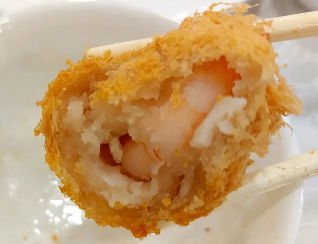 “鳳尾蝦蜂巢芋角”,用了蝦來做餡,有新意,芋角皮也做得細滑,口感很好,不過芋蓉無味,蝦也沒什麼味道,整體合格而已。