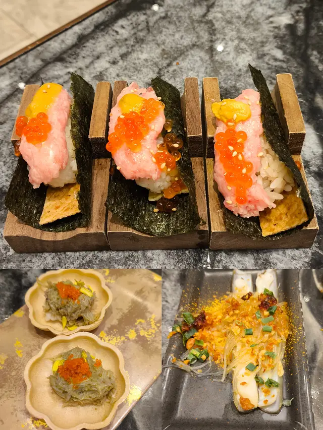 壽司選擇蟹肉蟹籽蟹膏軍艦,海膽拖羅雪魚干手卷,日本北海道海膽軍艦,最鍾意食海膽拖羅雪魚干手卷,手卷有餅底好香脆。