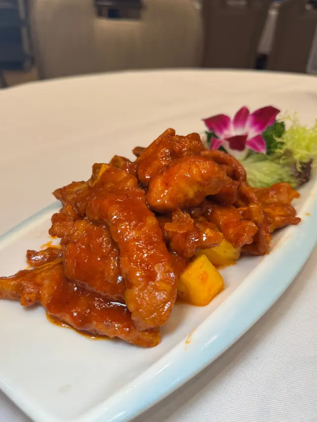 豬扒切成條狀包裹住甜甜醬汁,底部有菠蘿