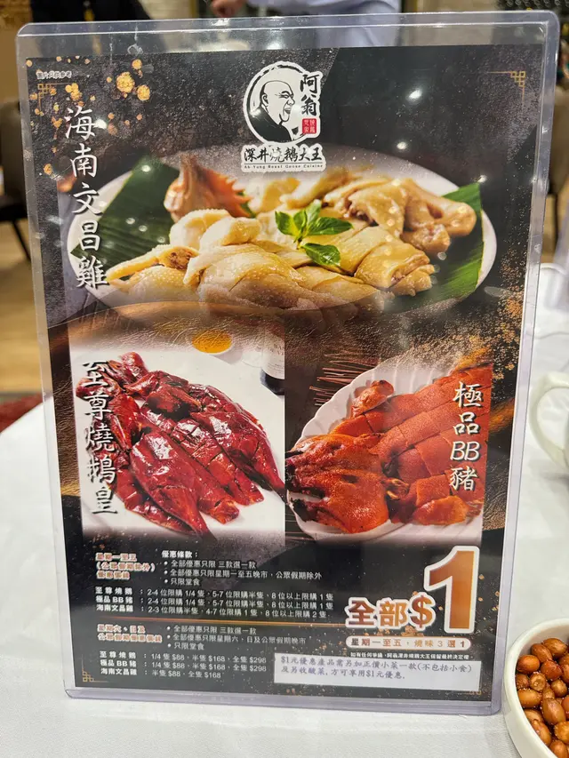 阿翁深井燒鵝大王平日晚市$1優惠 海南文昌雞/極品BB豬/至尊燒鵝王3選1