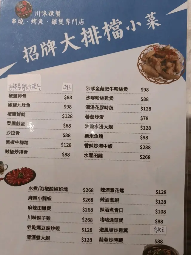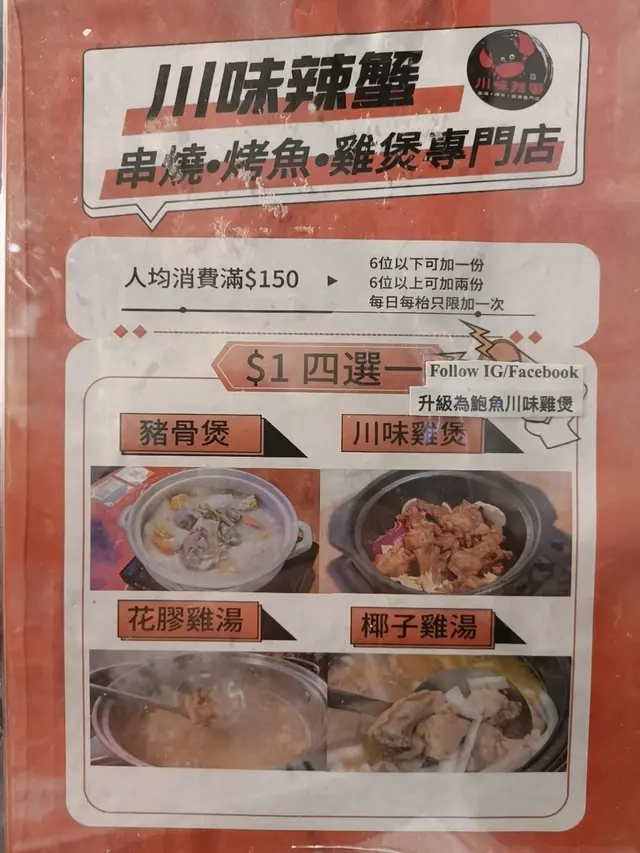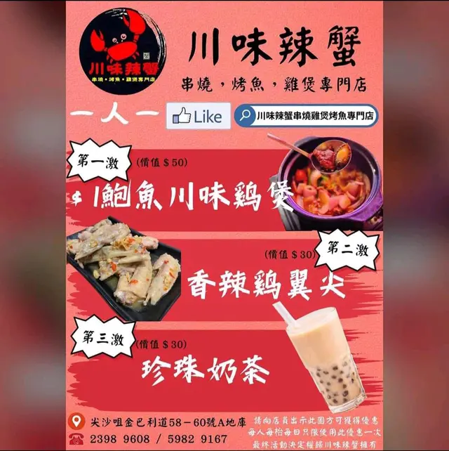 $1雞煲海鮮大咖串燒小菜應有盡有 DaydayYup等級32023-06-2258 瀏覽 關注 尖沙咀金巴利道的川味辣蟹串燒烤魚雞煲火鍋專門店集合了雞煲、海鮮、串燒、辣蟹等各種美食選擇,味道好又實惠。 現在該店推出了優惠,只要人均消費滿$150,再加一元就可以得到雞煲、豬骨煲、花膠雞湯或椰子雞湯。此外,用社交平台點讚還可以獲得鮑魚、辣雞翼尖和珍珠奶茶的贈品。 如果您還想品嚐大排檔小菜,呢度都有好多選擇, 我哋今晚就試左辣酒煮花螺, 好野味。還有,餐廳的海鮮大咖套餐也十分划算,只需$298,就可品嚐到包括蟶子、軟殼蟹、大元貝、鮑魚、蠔、小龍蝦、海蝦、青口和斑片在內的9款海鮮。該套餐以蒜蓉蒸的形式呈現,十分新鮮美味。 整體來說,這裡是個性價比很高的地方,款式很多,非常值得再次光顧。$1雞煲辣酒煮花螺海鮮大咖以上食評乃用戶個人意見 , 並不代表OpenRice之觀點。讚好分享川味辣蟹·串燒·烤魚·雞煲·專門店 https://s.openrice.com/QrbT0KKDA00檢舉 張貼 評分4味道4環境5服務4衛生5抵食推介美食$1雞煲辣酒煮花螺海鮮大咖用餐日期2023-06-21用餐途徑堂食用餐時段晚餐