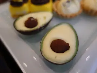 最令我期待的一款甜點,朱古力牛油果慕絲,以朱古力仿照切開的牛油果製成,造型幾可亂真。果殼及果核以瑞士 72 度黑朱古力製成,果肉則是香濃綿滑的牛油果慕絲,瞬間融化於舌尖,甜而不膩,外表很討女生歡心。