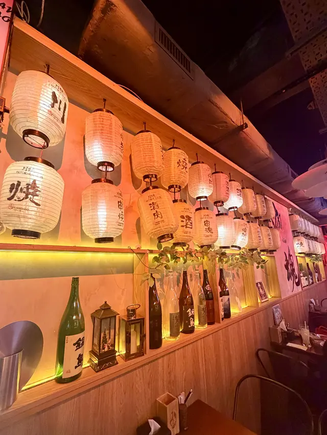 環境走日式串燒酒場風,牆上掛滿燈籠,燈光溫暖