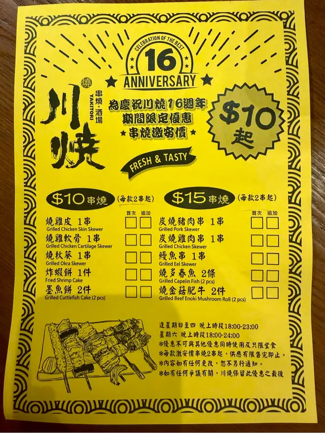 16週年店慶限定優惠,串燒激安價$10起回饋顧客