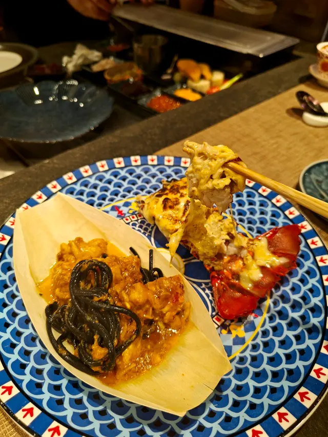 1味2食既龍蝦,芝士焗龍蝦,味道豐富又唔會太膩,肉質彈牙甘甜!味道相當濃厚。而旁邊係龍蝦膏,海膽,整成既醬汁做base再配龍蝦!口感綿滑有層次帶香,陣陣海膽鮮味,非常一流。