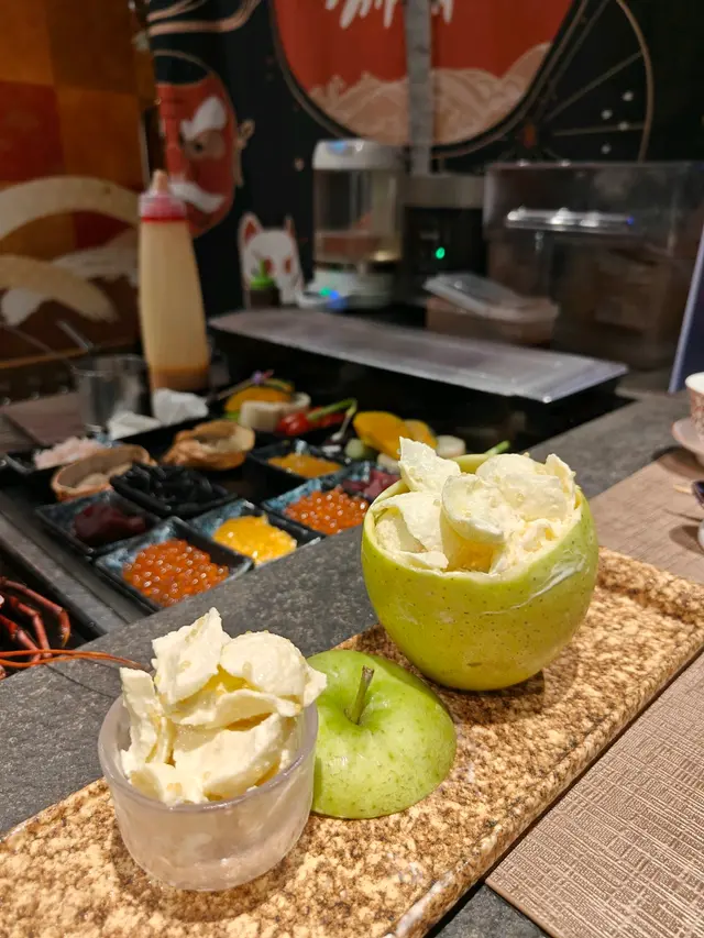 A5特選石垣和牛,用上x燒整法,肉質緊緻得黎嫩香,好香肉香而且又入味。旁邊亦係自家製士多啤梨味份子料理和醃紅油蘋果!