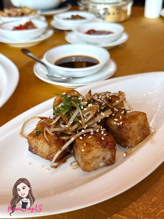 XO醬蘿蔔糕: 蘿蔔糕表面煎得微微焦香, 夾集了些少蘿蔔肉, 既有口感, 又食到蘿蔔清甜, 配上XO醬, 惹味!