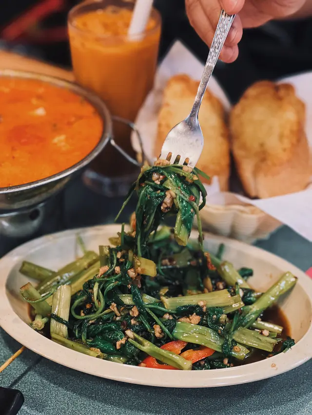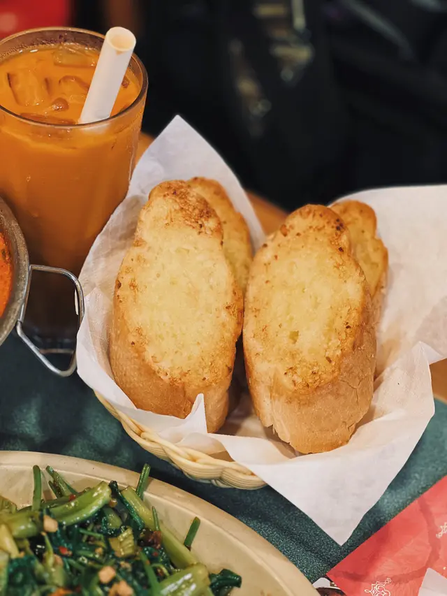 - 湯底酸辣平衡得好好:酸度爽快但吾刺喉,辣度係後勁上黎,暖胃但吾會蓋過海鮮鮮味。湯本身層次多,有檸檬草既清香、南薑既辛辣同香茅既草本香。入面料夠多:大蝦鮮甜有彈性,魷魚有彈牙口感,番茄煮到微軟帶鮮酸,雞髀菇吸滿湯汁又彈。每啖都有料,飲落係有滿足感既湯品。而蒜蓉包沾少少湯,麵包吸住湯汁會帶有蒜香同牛油味,愈食愈惹味。