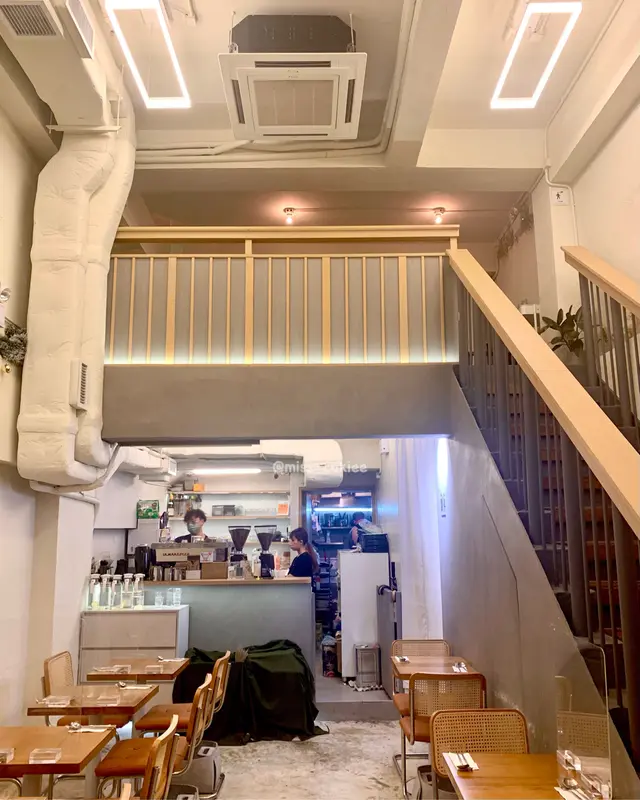 走簡約木系風格,地下嗰層是白色牆配木枱木凳木窗框,仲有大窗口位的吧枱,可以坐喺度望下人來人往的街景都幾有趣。
