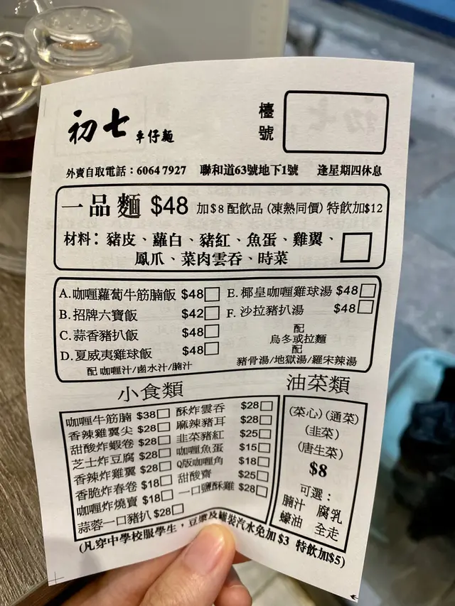 $38三餸一麵 仲送你一碟菜 皮皮超人等級42021-10-30815 views Follow 今日經過呢間初七車仔麵,見到佢店舖出面貼住一張poster,寫住下午茶餐$38仲會送一碟菜再加一杯熱飲😲我就係比咁抵嘅價錢吸引咗入去食嘢😬叫咗魚腐,滷水蛋,冬菇同埋米線配蕃茄湯底(一般車仔麵店又或者係米線店,配蕃茄湯底都要額外加錢,但係呢度居然唔使😵😵)1坦白講食物質素就真係中規中矩😶論米線嘅口感又或者係香滑程度,就真係冇辦法同譚仔//譚仔三哥比較😶而蕃茄湯底亦都唔係話好濃郁,但呢度勝在真係平,抵食,又夠飽肚😎 係慳家之選🤑The above review is the personal opinion of a user which does not represent OpenRice's point of view.LikeShare$38三餸一麵 仲送你一碟菜 初七車仔麵 https://s.openrice.com/QrbT0yQIW00Report Post Ratings3Taste3Decor3Service3Hygiene3ValueDining Method堂食