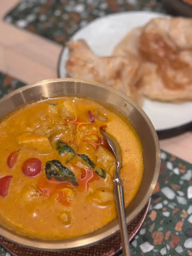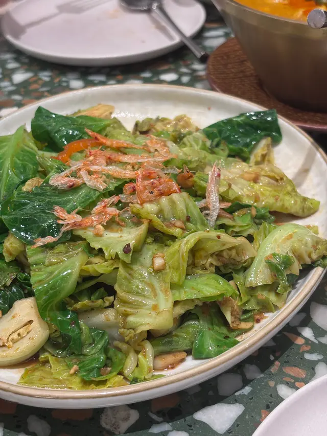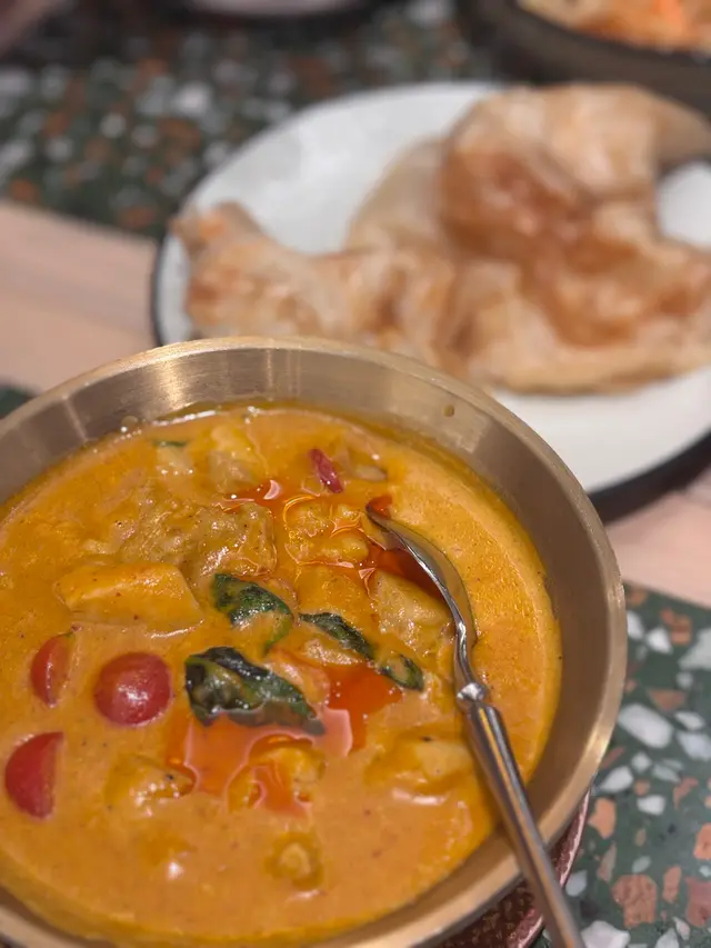 👑 必點項:黃咖喱溫柔辣浪🌶️,薄餅吸汁力MAX!櫻花蝦炒椰菜鑊氣十足,蝦乾鹹香撞擊爽脆菜葉,秒清盤。