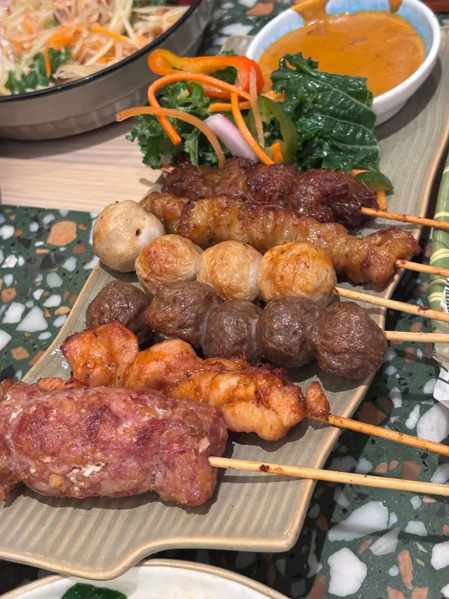 💡 驚喜位:串燒豬牛雞六重奏,沙嗲醬濃稠帶花生碎,炭香焦邊惹味到吮指!木瓜沙律青芒果絲爽脆,魚露酸辣開胃一流。