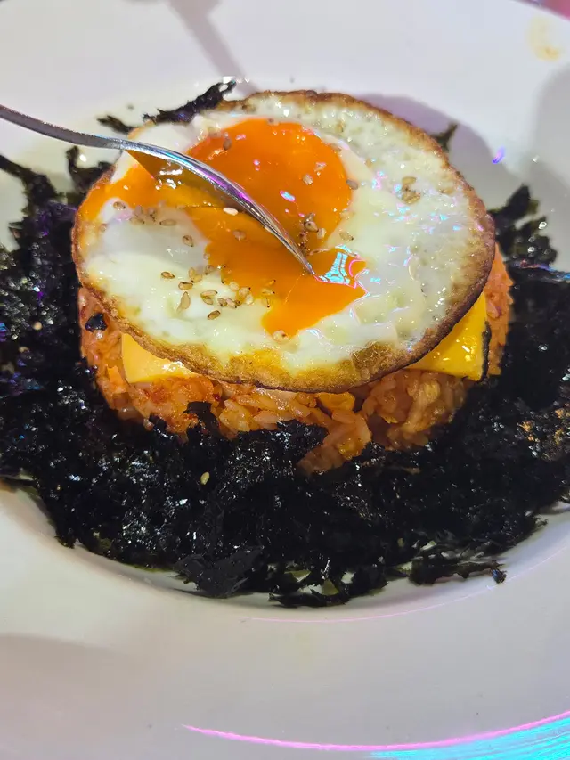 泡菜炒飯:加入金黃色的煎蛋和碎海苔,豐富了視覺層次。海苔碎和芝士的加入,為炒飯帶來淡淡的鹹香,提升風味。