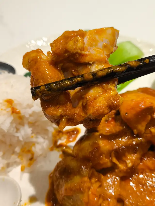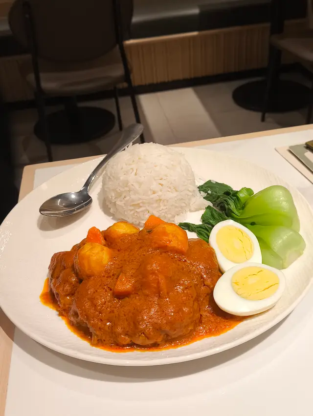 仁當咖喱雞扒材料有薯仔和紅蘿蔔,仁當咖喱微辣,雞扒口感嫩滑,油香肉滑,辣辣地好惹味.有雞蛋和小棠菜作伴碟,餐飲有熱咖啡,加配椰子雪糕。