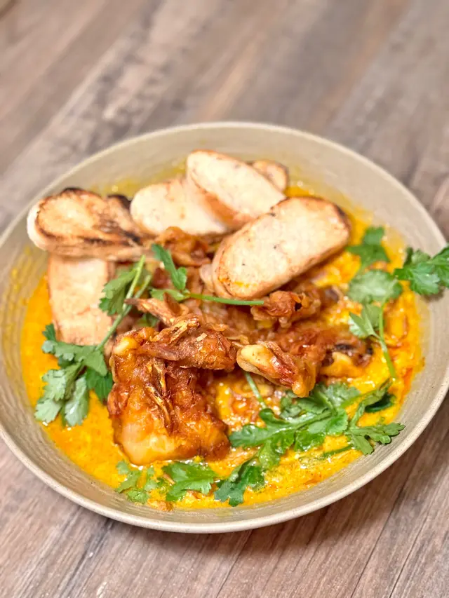 軟殼蟹炸得酥脆,蛋咖喱香濃帶微辣,九層塔香氣突出,蘸法包食超夾!蟹肉鮮甜,咖喱汁creamy得嚟唔膩,令人食唔停口🔥