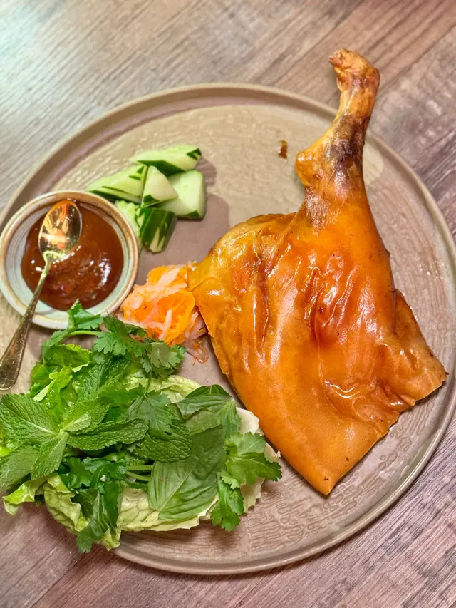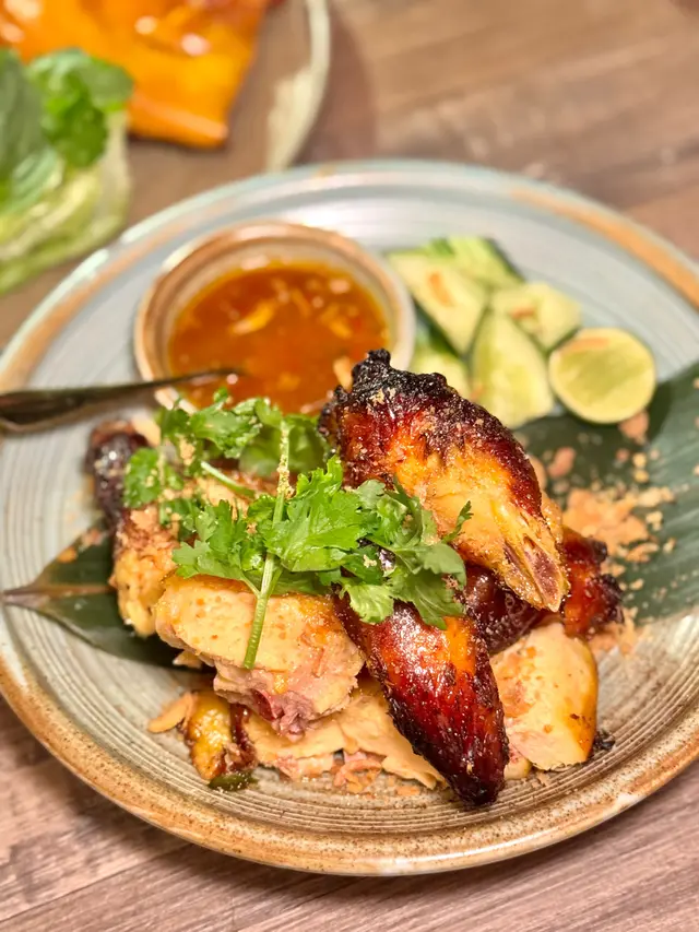 雞皮烤得金黃香脆,肉質嫩滑多汁,香茅同椰糖嘅甜香滲入雞肉,會安三風味汁酸甜微辣,風味獨特,必試👌