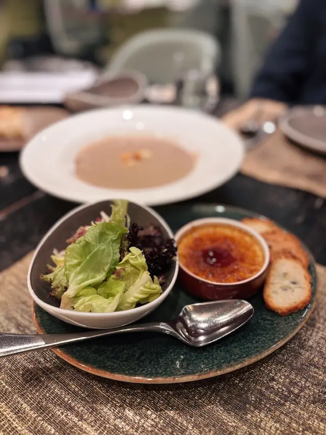 2. 法式鵝肝焦糖燉蛋配沙律:成餐對呢一味菜式最深刻。一味法國菜我哋都係第一次食係以鵝肝醬上面再配上焦糖,鵝肝醬濃郁夾埋焦糖會令到成件事好平衡,再喺香脆嘅法包上面沾上厚厚嘅一層醬,真係停唔到手呀。