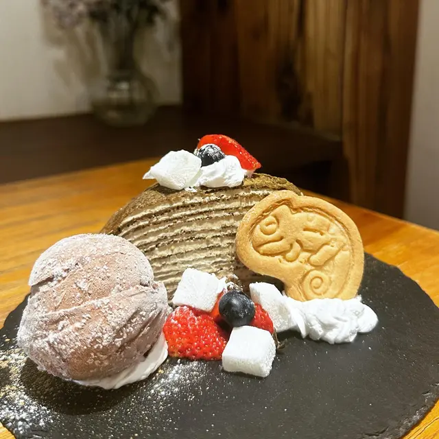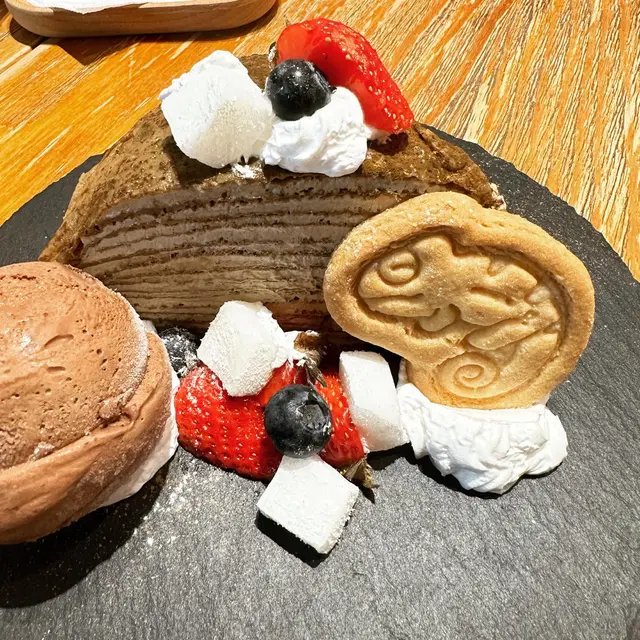 焙茶千層蛋糕好香濃焙茶味,唔會好甜,但一點都唔苦澀。每層的班戟皮都做得好薄身,中間搽滿平均的忌廉,而忌廉軟滑得來又好輕身,食晒成件都唔會好漏。
