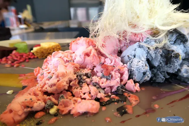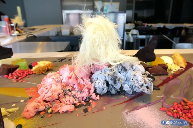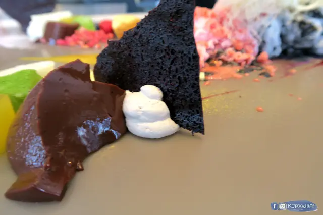 介紹下入面既食材,先黎就係頭先用上左液態氮整既雪糕,分別左竹炭朱古力味同士多啤梨荔枝味,一隻入口真係好濃朱古力味,另一隻就果味較重較清新,記得整完要等煙散哂先好食唔係就會痴住條脷。上面仲加上條條既龍鬚糖,用左咁特別咁靚既方式真係好有創意。