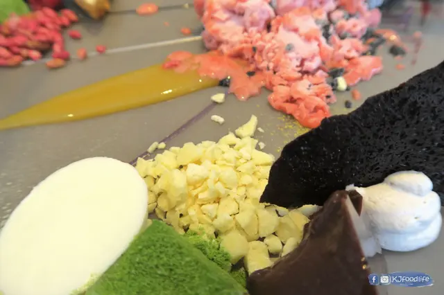 揀好左要《席前甜品》($348)之後,店員先俾左黑色白色同透明既枱墊我地揀,揀好之後就即時開始喇,先用上左四種唔同既材料黎畫左個Base先,有朱古力椰子芒果等等畫出黎。