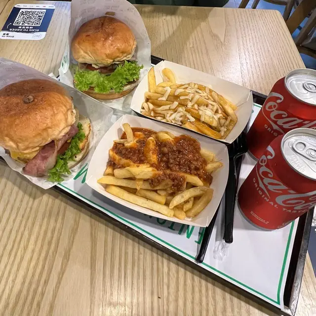 見到呢間Moo Moo keep住有客出入就試吓啦。佢哋嘅漢堡即叫即做,又真係聽落好吸引,就同同事揀咗兩個set, “🍔熱帶之堡 ($67) + 🍟肉汁芝士薯條配汽水🥤 ($29 升級)” 同 “🍔白菌之堡 ($65) + 🍟芝士肉醬薯條配汽水🥤 ($29 升級)” 。