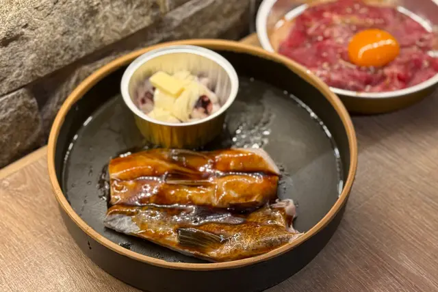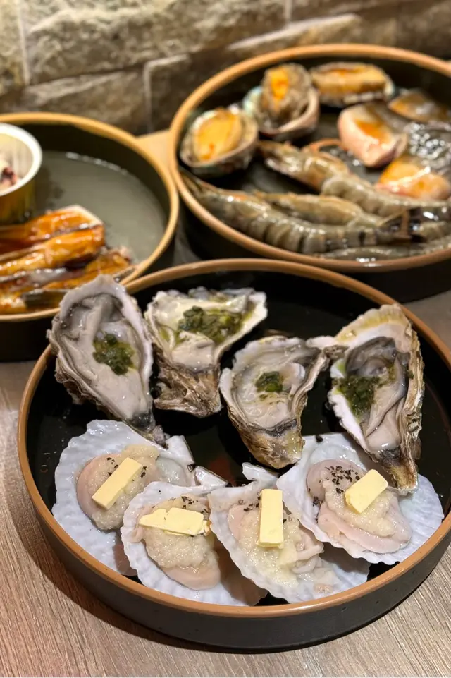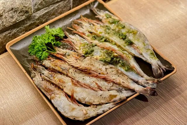 海鮮方面除了黃油蒜烤帆立貝、灸烤生蠔、屏東燒魚腹、灸香烤虎蝦等之外,最新必試炭烤白鱔、灸烤霸王蝦及威士忌釀鮑魚,炭烤白鱔燒得皮脆並逼出油香,肉質軟嫩。