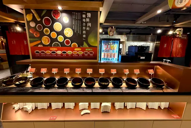 自助區有招牌黃金醬、薑味可樂醬、泰式海鮮醬、蒜味鹽醬、柚子醬、台灣甜辣醬等多款調味料任配任搭,令肉類口味層次更加豐富多彩。